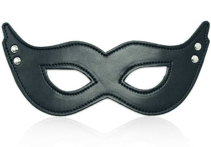 Черная маска Aziart фигурной формы с эластичной резинкой и металлическими заклепками. Изготовлена из искусственной кожи, на обратной стороне бархатное покрытие.