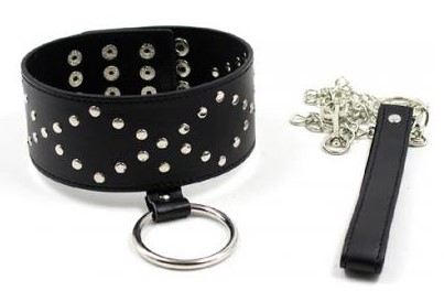 Черный широкий ошейник на регулируемой застежке, декорирован клепками и металлическим кольцом, к которому крепится поводок-цепочка с петелькой.