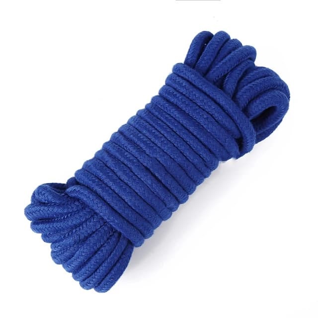 Веревка для связывания синего цвета. Вы можете ограничить подвижность рук, ног или всего тела, не прибегая к дополнительным аксессуарам, обходясь всего лишь одним-единственным шнуром. Он не травмирует поверхность кожи, хорошо фиксируется на теле и приятен на ощупь. Веревка из чистейшего хлопка безопасна, надежна и долговечна .