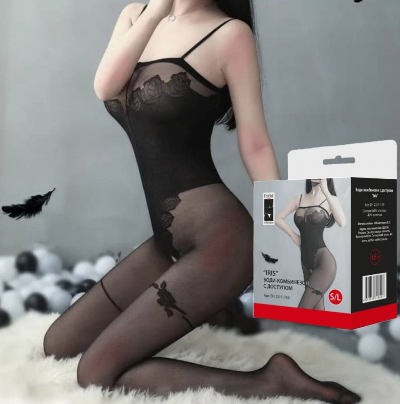 Боди-комбинезон "Iris" облегает тело. Красивый цветочный орнамент подчеркивает красоту линии груди и длину ног. Тонкие бретели подчеркивают хрупкость женских плеч. Рисунок на ноге в виде подвязки притягивает взгляды. Кэтсьюит имеет доступ в интимном месте.