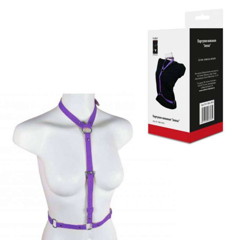 Портупея JENNA из эко-кожи фиолетового цвета. Длина, окружности шеи и бедер регулируются при помощи классических пряжек. Ширина ремешков – 1.5 см