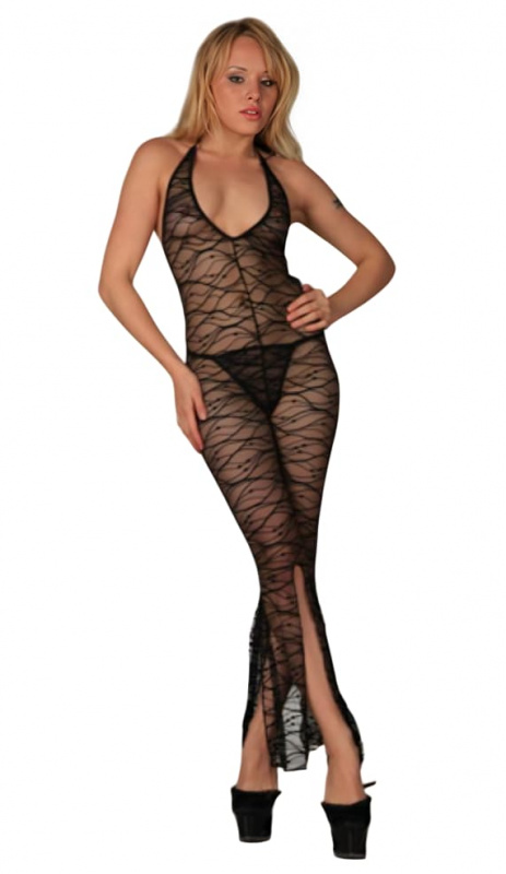 Боди-комбинезон эротический с открытой промежностью. В нижней части комбинезона идут разрезы по бокам голени ног. Вырез спереди обработан эластичной тесьмой, которая плавно переходит на шею и завязывается. Стринги в комплекте.