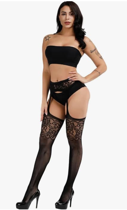 Сексуальные колготки, имитирующие чулки с поясом, отлично садятся на любую фигуру, подчеркивая женственные формы. За счёт эластичного материала имеют универсальный размер. Хорошо тянутся, приятны к телу, износостойки, мягкая резинка не впивается в талию. Имеют укреплённый мысок.