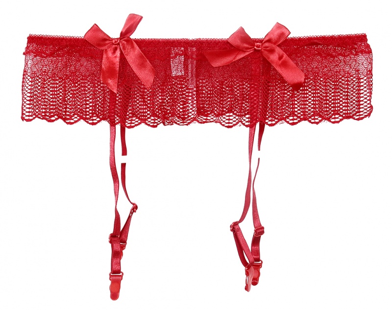 Красный классический пояс для чулок изготовлен из мягкой сеточки. Украшен двумя игривыми бантиками. Ширина полотна около 9 см. Чулкодержатели регулируются.