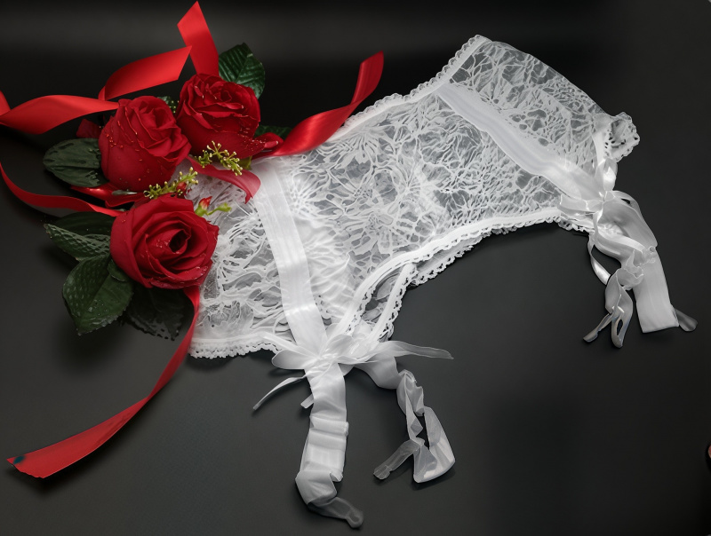 Пояс выполнен из тонкого воздушного кружева, подвязки регулируются по длине. Ширина пояса 15 см