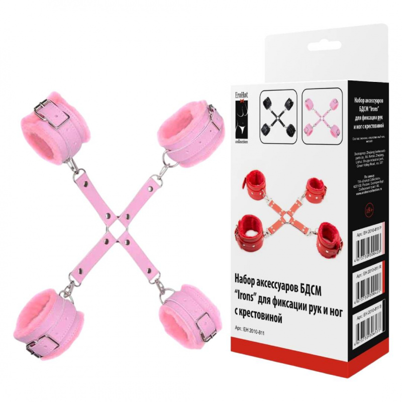 Набор аксессуаров БДСМ "Irons" для фиксации рук и ног с крестовиной розовый