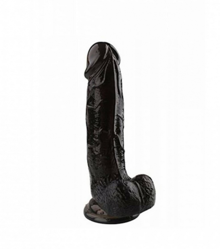 Фаллоимитатор с мошонкой черного цвета на присоске. Упругий гибкий ствол с выпуклыми венками и ярко-выраженной головкой.