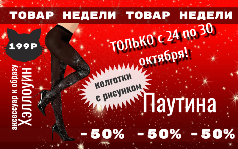 С 24 по 30 октября в акции "Товар недели" участвуют Колготки "Паутина"! Скидка 50% по ПРОМОКОДУ "СКИДКАНЕДЕЛИ"!