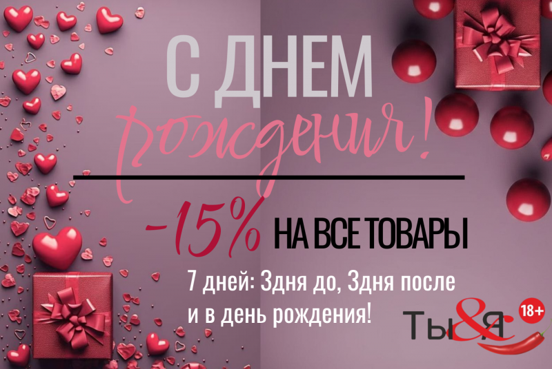В этот особенный день мы хотим порадовать Вас приятным подарком. Мы дарим Вам скидку 15% на все товары каталога (кроме Коробочки удовольствий, разделов БАД и Презервативы)